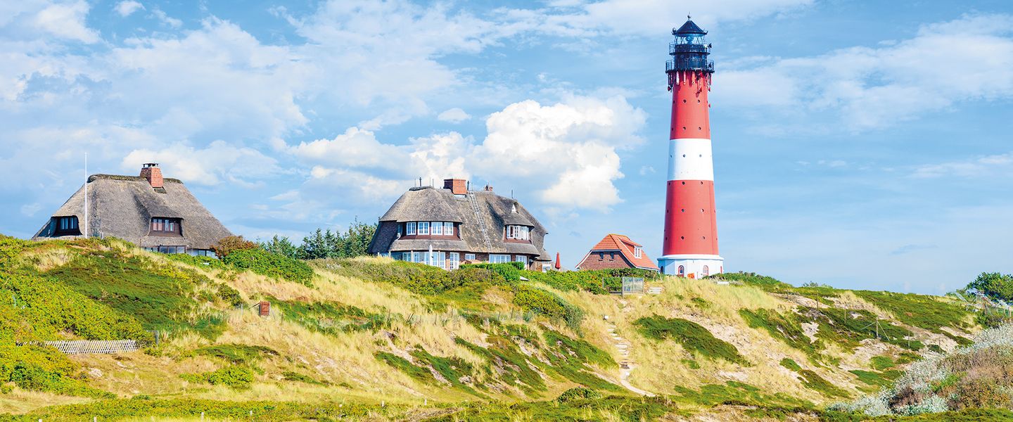Heute bringt Sie der Bus über die dänische Grenze zur Insel Rømø. Von dort aus setzen Sie mit der Fähre in etwa einer Stunde über zum Hafen von List auf Sylt. An der nördlichen Landspitze starten Sie Ihre Radtour durch die beeindruckenden Dünen des Naturschutzgebiets. Entlang des Weges blühen die Sylt-Rosen, während Möwen, Regenpfeifer und Austernfischer Sie begleiten. Halten Sie Ausschau nach den vielen Schmetterlingsarten und vielleicht sogar nach Schweinswalen oder Robben. Vom Leuchtturm „Langer Christian“ beim „Roten Kliff“ genießen Sie einen herrlichen Blick über die Insel. Vorbei an Kampen, dem Ort der „Schönen und Reichen“, radeln Sie zum großen Seebad Westerland, wo Sie an Deutschlands berühmtester Fischbude „Gosch“ eine köstliche Mittagspause einlegen. Ihre Tour führt Sie weiter durch das Seevogelschutzgebiet Rantumer Becken und die einstige Hauptstadt Keitum, die mit ihren reetgedeckten Kapitänshäusern und liebevoll gepflegten Gärten als der idyllischste Ort auf Sylt gilt.